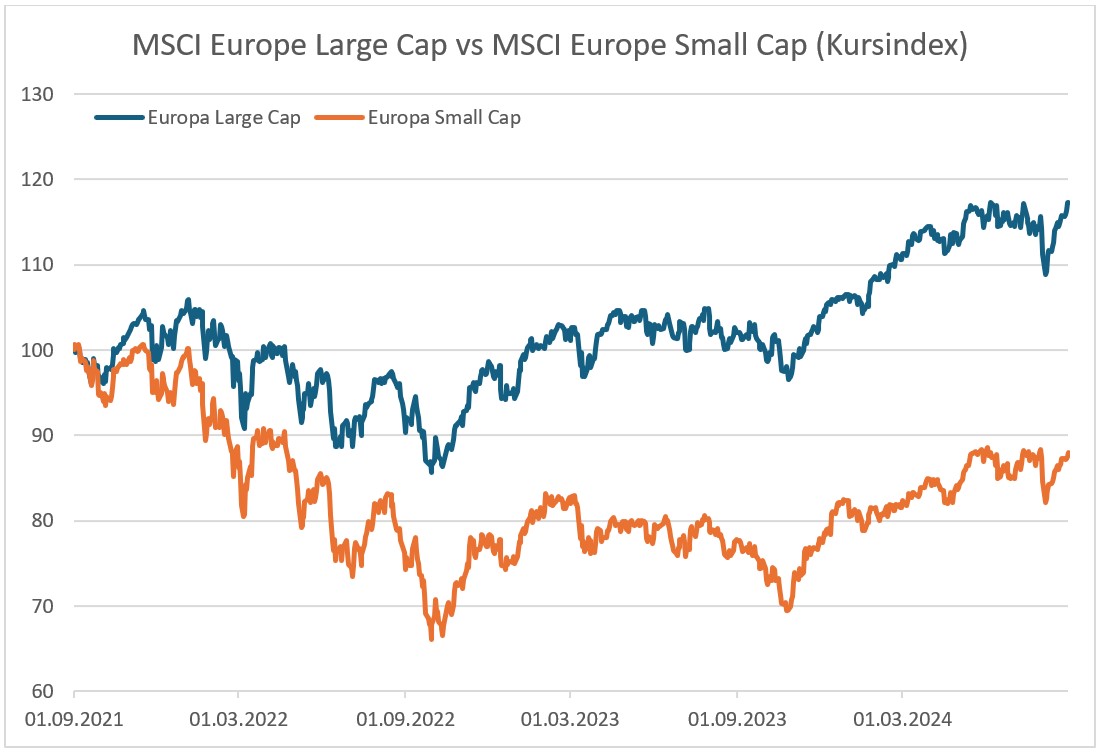 In den letzten Jahren haben sich an den europäischen Aktienmärkten grundlegende Verschiebungen ereignet. Traditionell galten Aktien von Nebenwerten, also Unternehmen mit geringer Marktkapitalisierung, als profitabler als die von großen Unternehmen. Diese Regel schien jedoch seit September 2021 außer Kraft gesetzt. Der MSCI Europe Small Cap Index, der die Performance kleinerer Unternehmen misst, liegt seitdem fast sechs Prozent im Minus, während der MSCI Europe Large Cap Index, der die großen Unternehmen abbildet, um mehr als 25 Prozent zulegen konnte. Europäische Nebenwerte sind damit aktuell im Vergleich zu großen Unternehmen so günstig bewertet wie zuletzt während der Finanzkrise 2008.