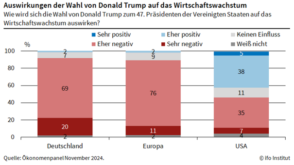 In einer aktuellen Umfrage des „ifo Instituts“ erwarten die meisten Ökonomen negative Wachstumseffekte: 20 % rechnen mit sehr negativen und 69 % mit eher negativen Effekten. Nur 7 % sehen keinen Einfluss und 2 % erwarten eher positive Effekte. Ähnlich sieht es für Europa aus: 11 % erwarten hier sehr negative und 76 % eher negative Auswirkungen. Nur 9 % sehen keinen Einfluss und 2 % eher positive Effekte.