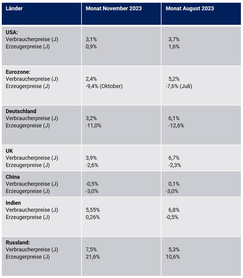 Entspannung für die Weltwirtschaft ergab sich im vierten Quartal 2023 an der Inflationsfront. Grundlage waren unter anderem sinkende Ölpreise. Im Verlauf kam es zu Preisrückgängen von mehr als 90 USD auf zwischenzeitlich unter 75 USD (Nordseesorte Brent) pro Fass. In der Folge stellte sich seit September 2023 in der Eurozone ein Rückgang der Verbraucherpreise von 4,30 % auf 2,40 %, in den USA von 3,70 % auf 3,10 % und in China von 0,00 % auf -0,50 % ein. Als Konsequenz setzten die großen westlichen Zentralbanken (Federal Reserve, EZB, Bank of England) ihren Zinserhöhungszyklus aus. Während des Quartals bauten sich Zinssenkungserwartungen für das kommende Jahr auf. Losgelöst davon wirken Zinserhöhungen sich erst voll mit einem Zeitversatz von 12 und mehr Monaten aus. Entsprechend ist und bleibt zunächst das erhöhte Zinsniveau ein derzeit die Konjunktur bremsender Einfluss.