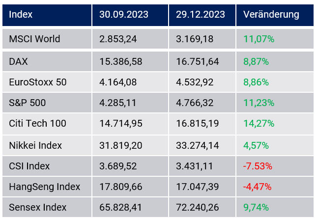 Es kam nach der Korrektur im dritten Quartal 2023 mit Ausnahme der Aktienmärkte Chinas und Hongkongs zu einem freundlichen Verlauf der Aktienmärkte im vierten Quartal 2023.