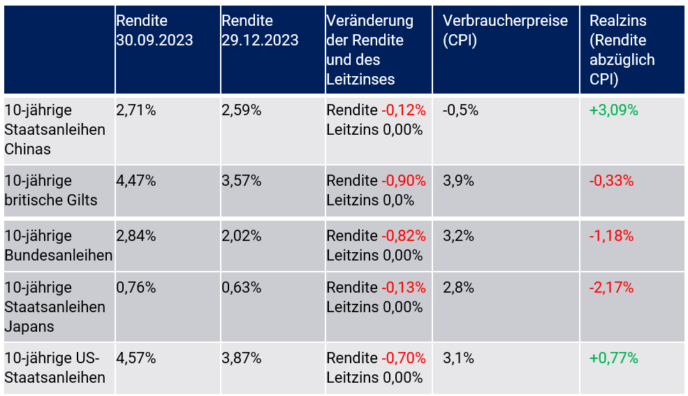 Trotz des deflationären Umfelds in China verzichtete die Zentralbank Chinas im vierten Quartal 2023 auf Zinssenkungen.