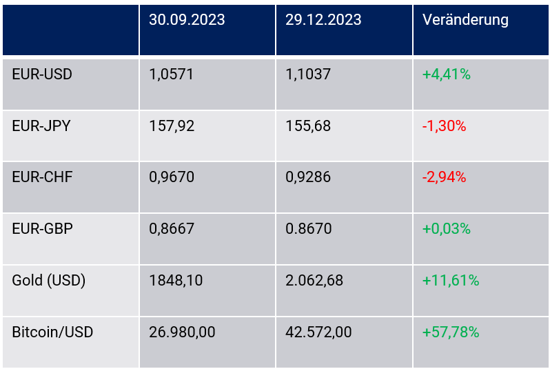 Die Zentralbanken der westlichen Hemisphäre entschieden sich für eine abwartende Haltung. Japan hielt unverändert an der Negativzinspolitik fest (Leitzins -0,10 %). Die EZB hat im vierten Quartal auf den beiden Sitzungen den Leitzins bei 4,50 % belassen, ebenso die Federal Reserve bei 5,375 %, die Bank of England bei 5,25 % und die Schweizer Nationalbank bei 1,75 %.