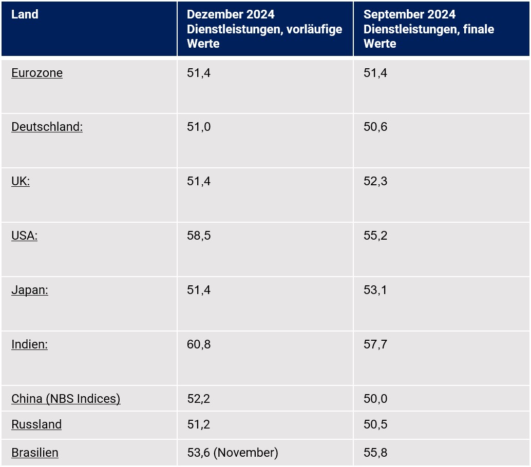 Unter Zugrundelegung der aktuellen Einkaufsmanagerindices (Sentiment-Indikatoren, Frühindikatoren, Scheidewert zwischen Wachstum und Kontraktion 50 Punkte) als Bewertungsmaßstab ergibt sich zum Ende des 4. Quartals 2024 ein heterogenes Bild zu Lasten Kontinentaleuropas. Die USA führen im gesamtwirtschaftlichen Zuschnitt (Composite Index) mit 56,6 Zählern vor Japan mit 50,8 Zählern, Großbritannien mit 50,5 Punkten und der Eurozone mit 49,5 Punkten (Deutschland 47,8).