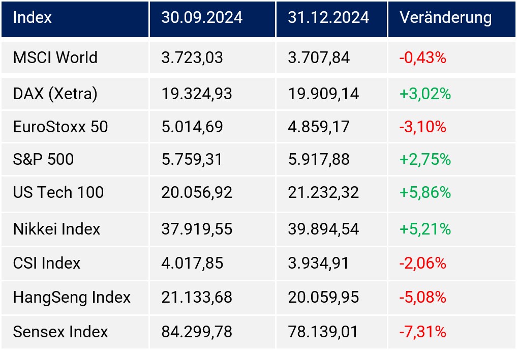 Das Herbstquartal war für die westlichen Aktienmärkte mit Ausnahme des EuroStoxx 50 und unter Inkludierung des Nikkei positiv. Das gilt jedoch nicht für den Rest der bedeutenden Aktienmärkte des Fernen Ostens. Dort dominierten Verluste. Diese Divergenz machte sich am MSCI-World Index fest, der im Quartalsvergleich trotz des hohen Anteils an US-Werten leicht an Boden verlor (-0,43%). Die klassische Jahresschlussrally versandete Mitte Dezember (DAX 13.12.2024 mit Allzeithoch bei 20.522,82 Punkten). Global ergab sich die schwächste Performance der Jahresendrally seit 1966.