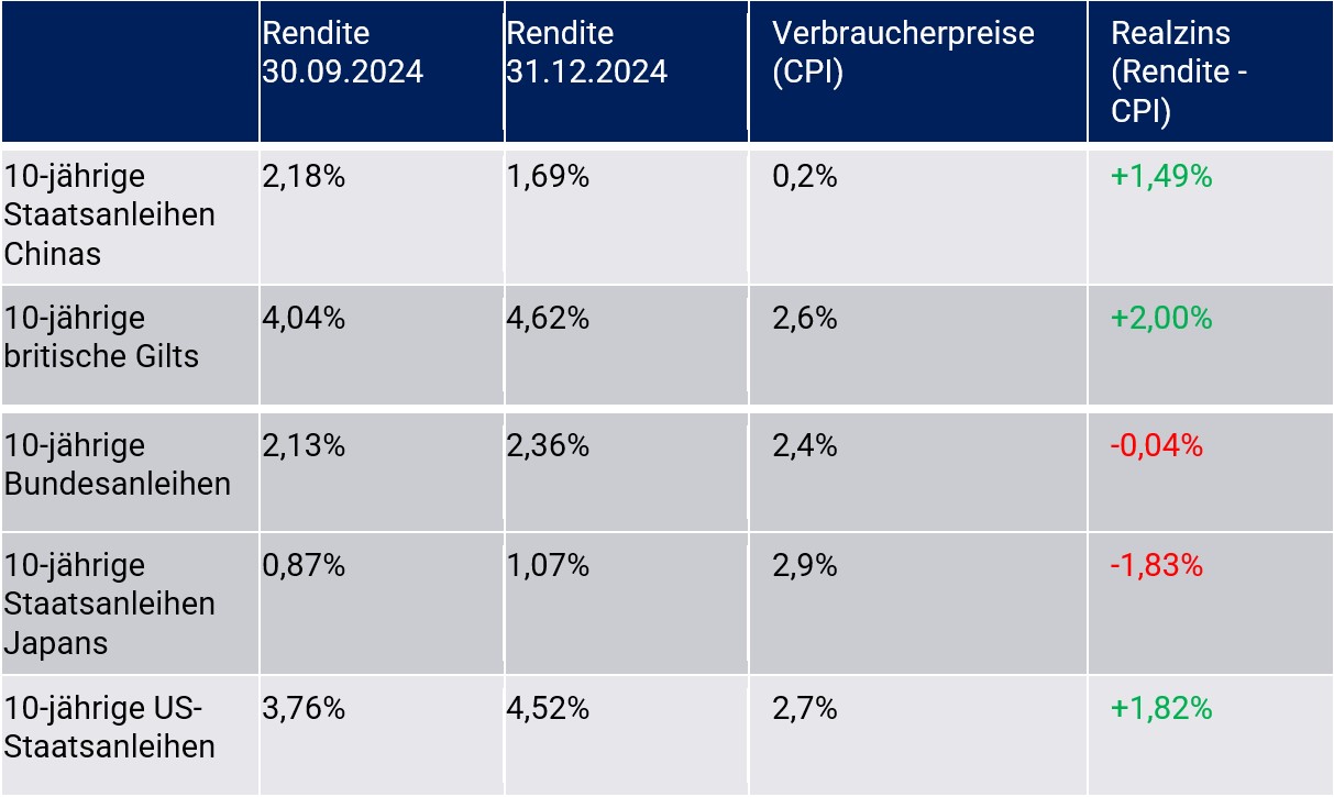 Die Rentenmärkte der USA und Europas zeigten sich im Verlauf des 4. Quartals 2024 in schwacher Verfassung. Hintergründe sind reduzierte Leitzinssenkungserwartungen, höhere Verbraucherpreise und teilweise unsolide Staatsfinanzen. Das gilt auch für Japans Rentenmärkte, jedoch nicht für China. Dort wirkten sich die Zinssenkungen am Kapitalmarkt umfänglich entlastend aus. Hintergrund ist die im Gegensatz zu den westlichen Ländern rückläufige und schwache Inflationsentwicklung.