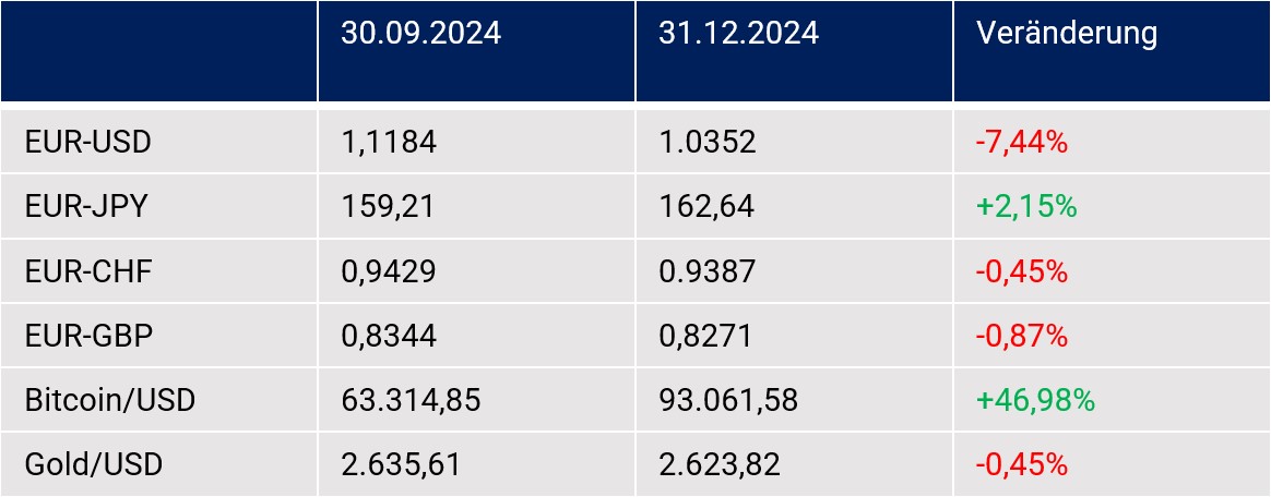 An den Devisenmärkten verlor der Euro gegenüber dem USD signifikant an Boden. Die Zinssenkungserwartungen in den USA sind gegenüber dem Vorquartal deutlich reduziert. Die ökonomische Divergenz zu Lasten Europas und zu Gunsten der USA ist signifikant und wird sich dank der Politikansätze der Trump-Regierung ausweiten. Zudem ist Kontinentaleuropa politisch dysfunktional, allen voran die Schwergewichte Deutschland und Frankreich. Die JPY-Schwäche ist dagegen maßgeblich bedingt durch den Verzicht auf Zinserhöhungen. Das aktuelle Leitzinsniveau von 0,25% und Kaitalmarktzinsniveau (10-jährige Staatsanleihen) bei 1,07% fällt gegenüber den Zinsniveaus des USD, des GBP und des EUR ab. Gold als Währung ohne Fehl und Tadel konnte die erhöhten Niveaus knapp halten. Die Krypto-Anlage Bitcoin profitierte massiv, da die Trump-Regierung eine positive Grundhaltung zu dieser Anlageklasse pflegt.